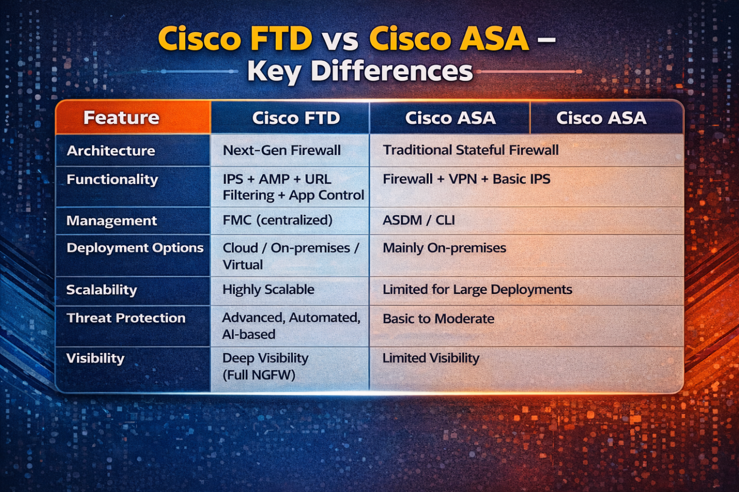 Cisco Firepower Threat Defense (FTD) සහ Cisco Adaptive Security Appliance (ASA) කියන්නේ ලොകരක්ම IT සංවිධාන network සුරක්ෂිත කරගන්න භාවිතා කරන ප්රමුඛ security appliances දෙකක්. මේ දෙකම cyber attacks වලින් වෙළෙඳසැල්, සමාගම්, රජයේ ආයතන ආදිය ආරක්ෂා කරන්න specially design කරපු devices.